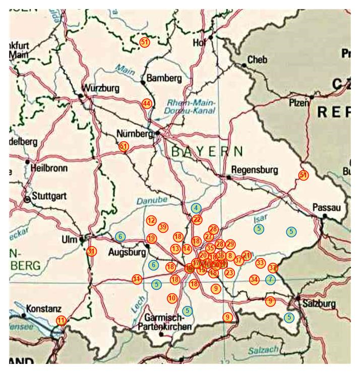 Die nachfolgende Grafik zeigt die ungefähren Standorte der Projekte in Bayern. Anhand der Nummern kann das entsprechende Projekt in der Referenzliste gefunden werden.